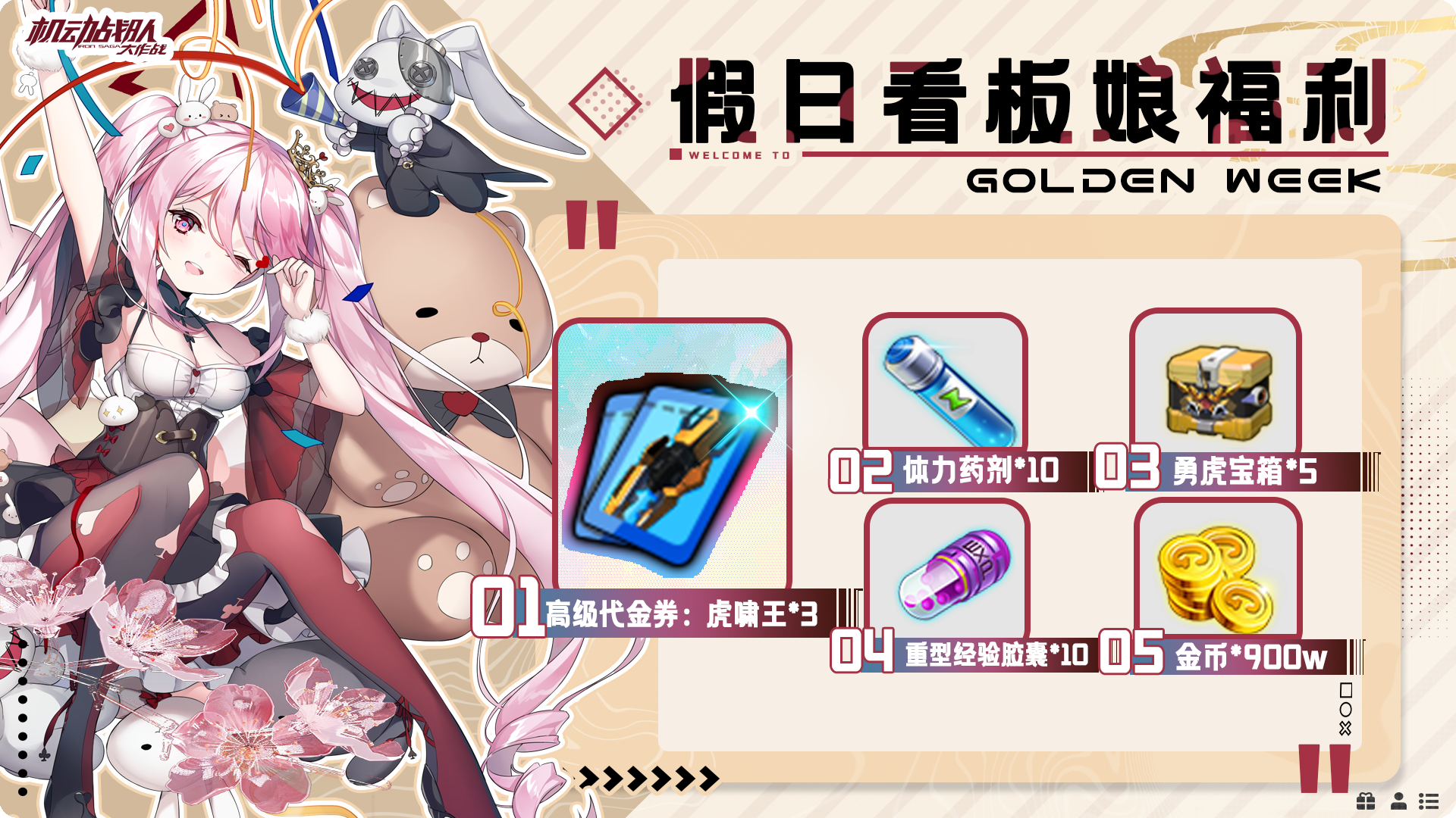 活动期间,指挥官可登录游戏领取假日看板娘福利。奖励内容:【高级代金券:虎啸王】*3、体力药剂*10、重型经验胶囊*10、勇虎宝箱*5、研发物资*9w、金币*900W。