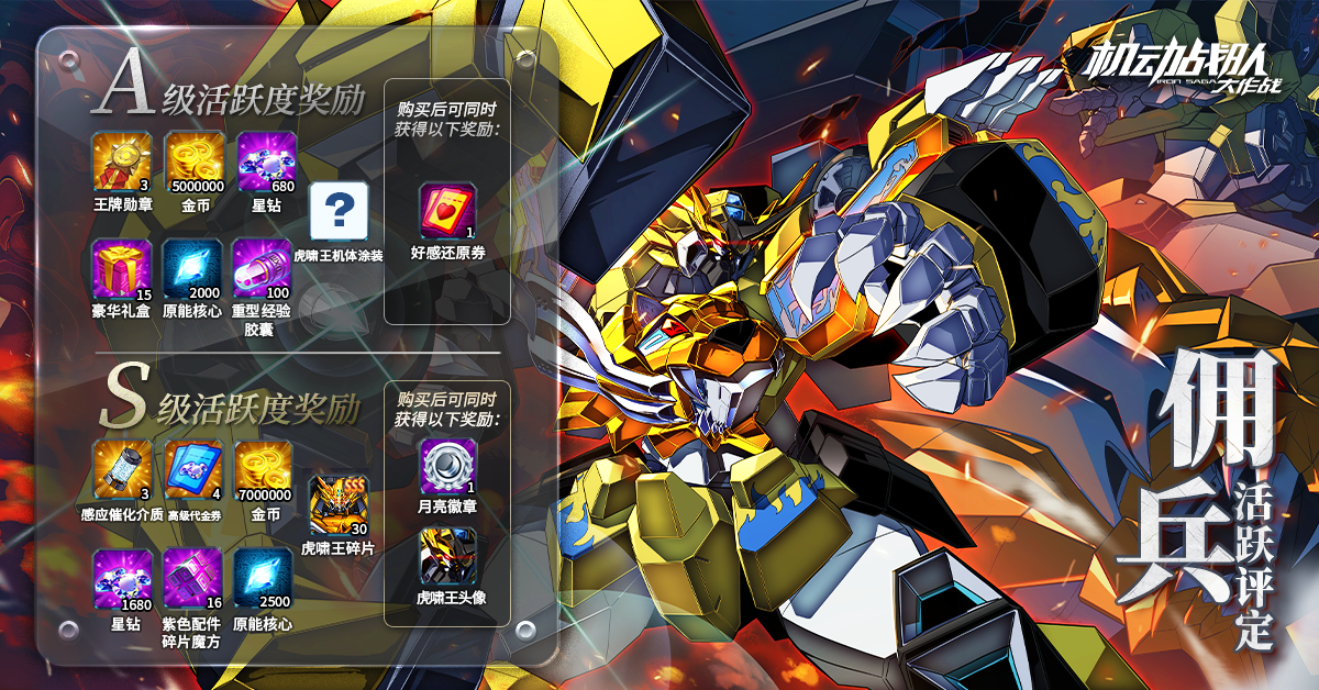 更新后将开启全新的佣兵活跃评定内容,本次奖励内容将包含全新机体【虎啸王】碎片、专属头像及【虎啸王】机体涂装方案。等级达到10级的指挥官可通过“佣兵”参与。