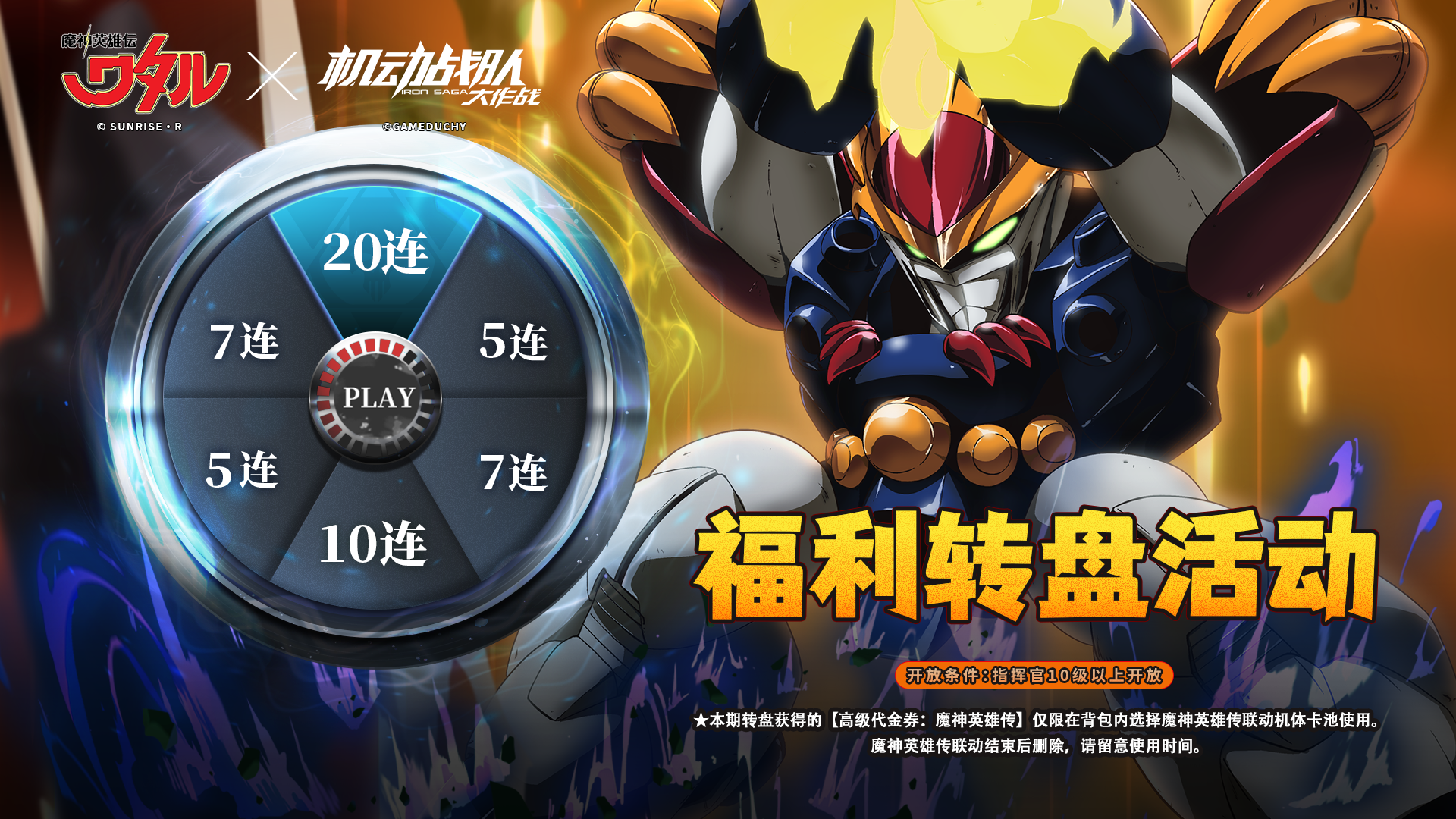限时登录转盘活动将在联动更新后同步开启,活动期间连续登录游戏,即可参与机体转盘活动。本次转盘活动持续5日,转盘获取的【高级代金券:魔神英雄传】绑定魔神英雄传联动机体卡池,仅限活动期间使用~